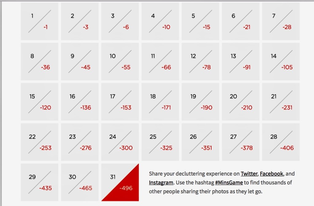 Josh & Ryan have created a challenge…#lessisnow, where you attempt to spend 31 days decluttering. On day one you get rid of one item, day two three items, day three six items, day four ten items etc etc. You can find the guide on their web site under resources, but heres the plan…