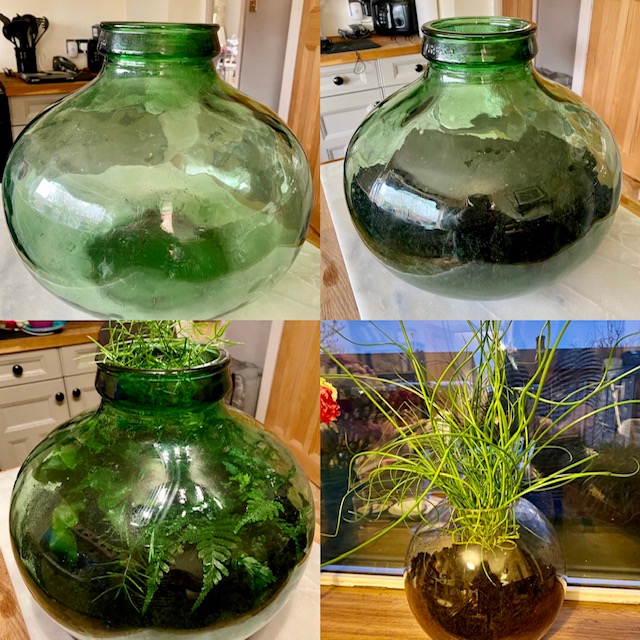 I had fun yesterday…I did some indoor gardening. I bought some plants for my bottle garden, but ended up with too many. So then I had to find another pot/bowl for the poor plant that didn’t make the bottle.